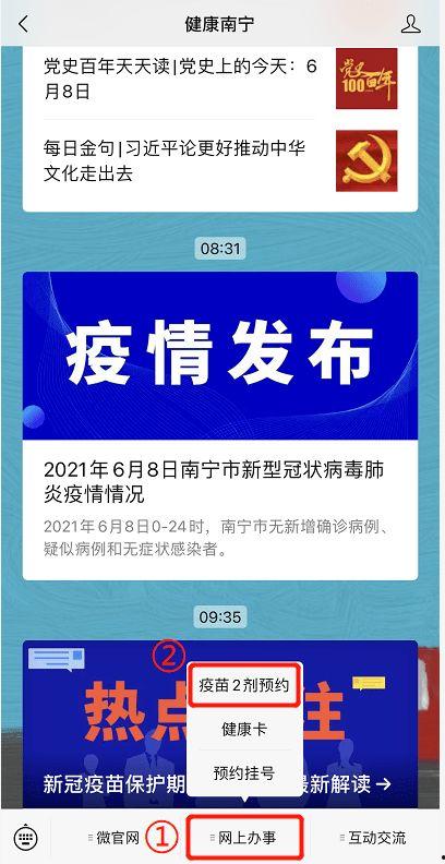 1. 关注“南宁疾控”微信公众号,在线预约接种;